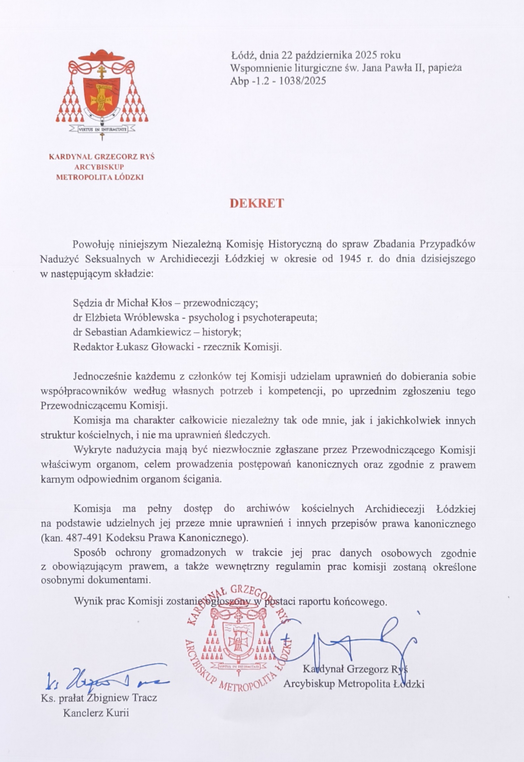 Komisja została powołana 22 października 2025 r. dekretem metropolity łódzkiego, kard. Grzegorza Rysia. W skład Komisji wchodzą: sędzia dr Michał Kłos (przewodniczący), dr Elżbieta Wróblewska (psycholog i psychoterapeuta), dr Sebastian Adamkiewicz (historyk) i Łukasz Głowacki (rzecznik prasowy).